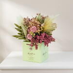 This exquisite bouquet features a harmonious blend of pepper berries, palms, goat grass, preserved roses, setaria, and nigella, creating a visually captivating display that requires no maintenance. Perfect for adding a touch of sophistication to any room or as a thoughtful gift.
