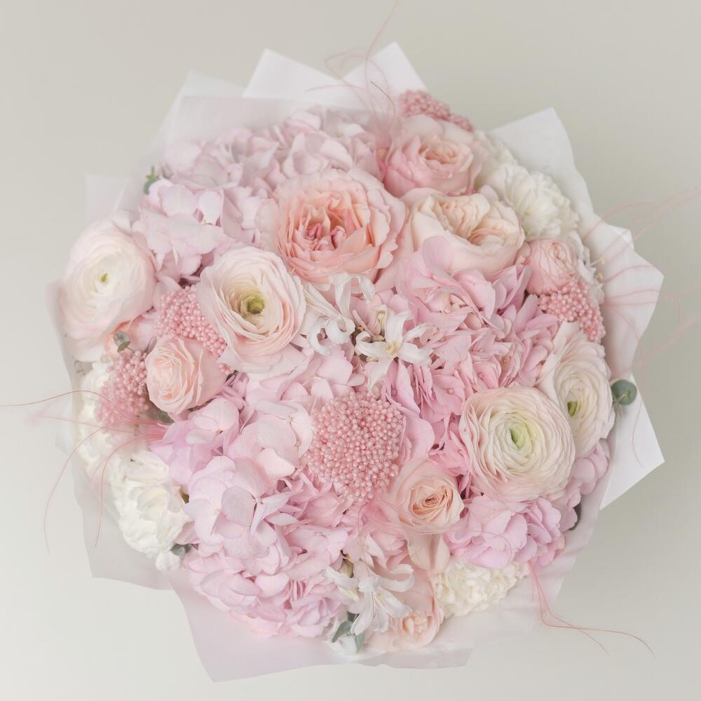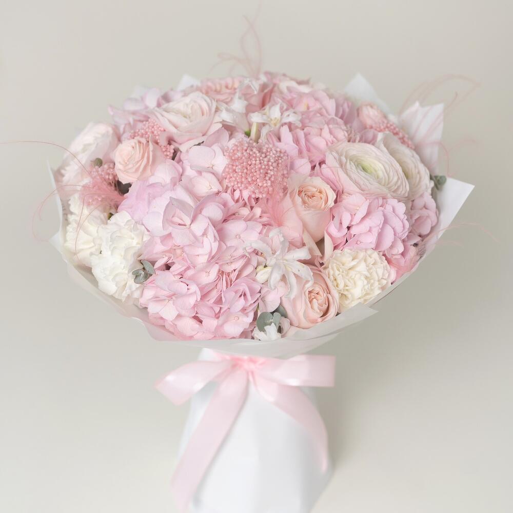 Beautiful soft touch mix of hydrangeas, roses, spray roses and other flowers made to impress her with the light touch of professional florists from Coral Flowers team