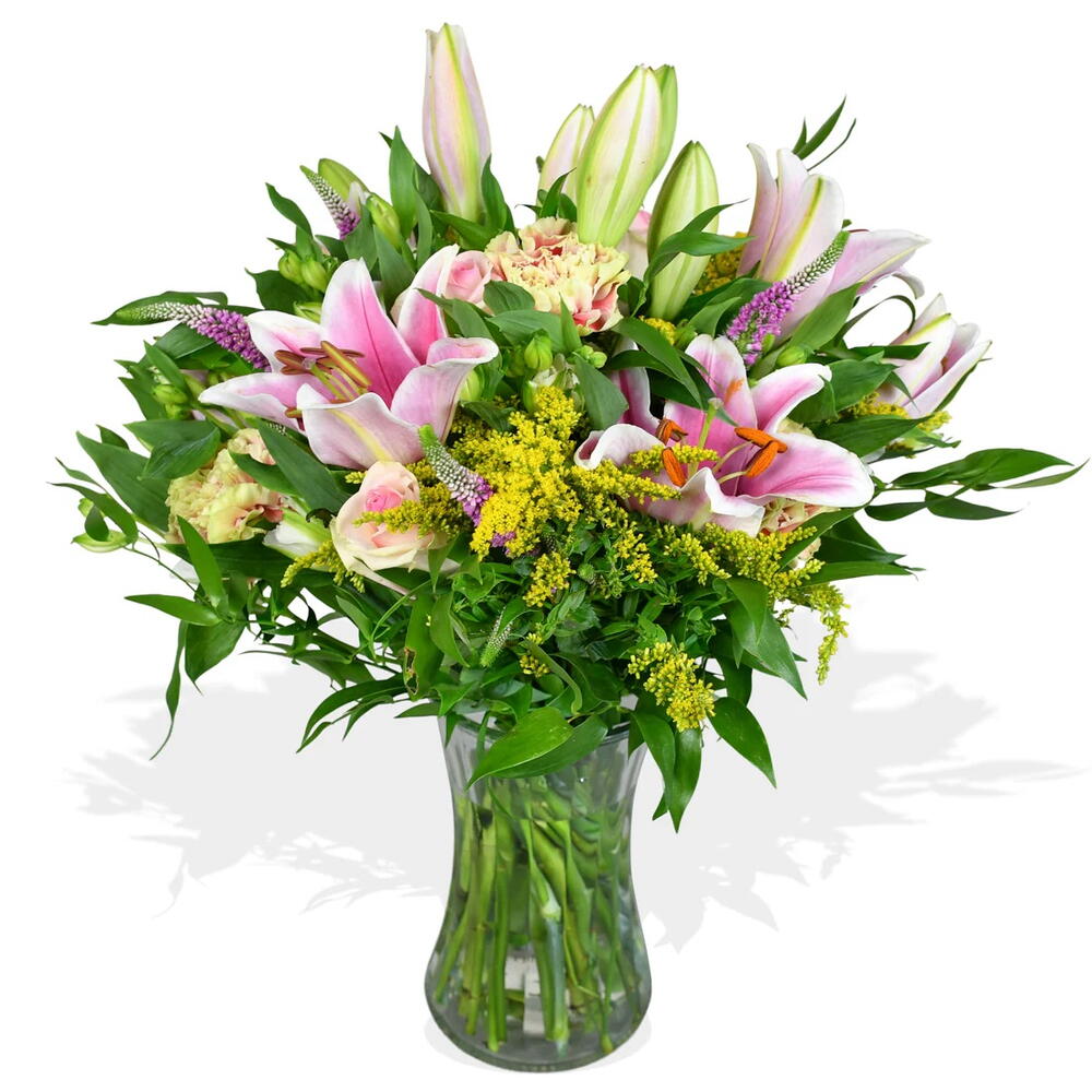 Veronica - 5 pcs Solidago - 5 pcs carnations - 5 pcs pink lilies - 2 pcs pink roses - 5 pcs