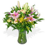 Discover the beautiful combination of lilies, roses, veronica, solidago, carnations, and alstroemeria in our Sorbet bouquet. Perfect for adding a pop of color to any space, this bouquet is sure to be a stunning addition to your floral collection.