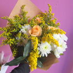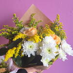 Roses, with their velvety petals and captivating fragrance, symbolize love and passion. Chrysanthemums, known for their diverse colors and intricate blooms, represent joy and longevity. Solidago, with its feathery plumes of golden-yellow flowers, adds a touch of sunshine and symbolizes good fortune. Together, these flowers create a harmonious blend of emotions and meanings. The roses convey deep affection, the chrysanthemums bring wishes of happiness and long life, and the solidago adds a touch of optimism and prosperity. This combination is perfect for expressing heartfelt sentiments and celebrating life's special moments. Whether arranged in a classic bouquet or a contemporary display, roses, chrysanthemums, and solidago create a visually stunning and emotionally resonant composition. Their combined beauty and symbolism make them an ideal choice for expressing love, gratitude, and best wishes.
