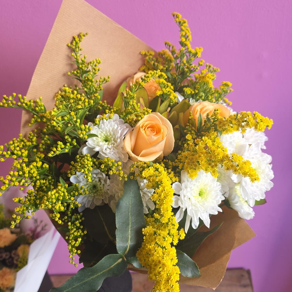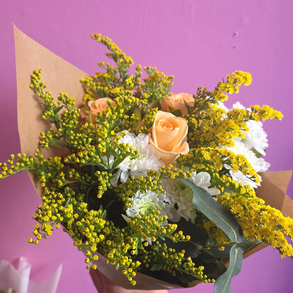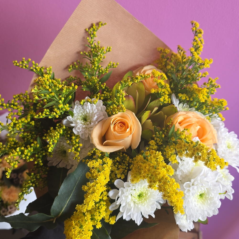 Roses, with their velvety petals and captivating fragrance, symbolize love and passion. Chrysanthemums, known for their diverse colors and intricate blooms, represent joy and longevity. Solidago, with its feathery plumes of golden-yellow flowers, adds a touch of sunshine and symbolizes good fortune. Together, these flowers create a harmonious blend of emotions and meanings. The roses convey deep affection, the chrysanthemums bring wishes of happiness and long life, and the solidago adds a touch of optimism and prosperity. This combination is perfect for expressing heartfelt sentiments and celebrating life's special moments. Whether arranged in a classic bouquet or a contemporary display, roses, chrysanthemums, and solidago create a visually stunning and emotionally resonant composition. Their combined beauty and symbolism make them an ideal choice for expressing love, gratitude, and best wishes.