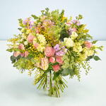 An effortlessly elegant bouquet with a mellow, pastel shaded colour palette. We’ve brought together our premium spray roses in cream and pink with creamy scented stocks and fresh eucalyptus. This is the bouquet to accompany best wishes or declarations of love; to bring glad tidings or greet distant friends.