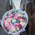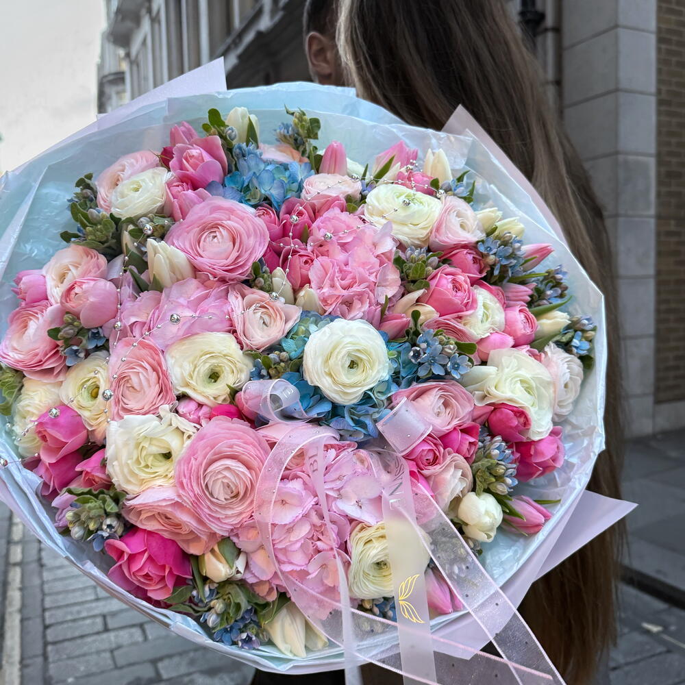 An elegant, designer bouquet that harmoniously combines 20 satin tulips, 5 bushy hydrangeas, 20 bright ranunculus, 10 miniature spray roses and 20 slender occipitals. This bouquet will be a wonderful gift that will make an unforgettable impression and give a lot of joy. It is like a musical composition, where every note sings the power of beauty and freshness.