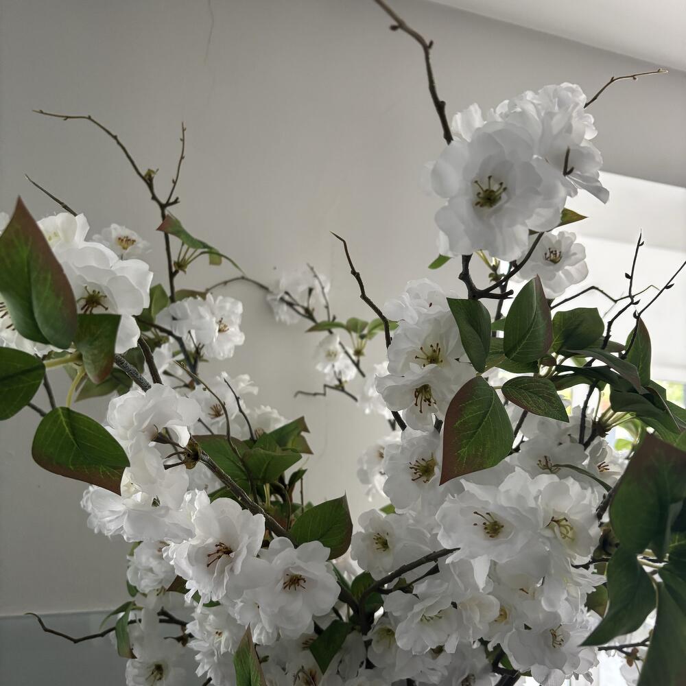 This elegant floral arrangement features delicate white blossoms with lush green leaves, artfully displayed on natural branches. Presented in a timeless, textured off white ceramic vase, it exudes freshness and sophistication. Perfect for brightening any space, the arrangement blends organic beauty with minimalistic charm, creating a serene, uplifting centrepiece ideal for modern interiors or special occasions. Vase included. Vase style may vary based on availability, but we promise it’ll be just as beautiful. Elements: White cherry blossom branches 7 pcs White ceramic vase