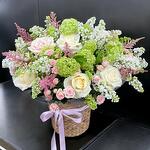 The Spring Whisper basket is a delicate celebration of the season, overflowing with a harmonious blend of pastel tones and soft textures. Designed to bring freshness and charm to any space, this floral basket features creamy roses, soft blush spray roses, whimsical astilbe, and vibrant green hydrangeas, making it a perfect gift for any spring occasion. Keep the basket in a cool location away from direct sunlight and heat. Check moisture levels in the floral foam and lightly water as needed to maintain hydration. Remove any wilted blooms promptly to allow others to flourish longer.