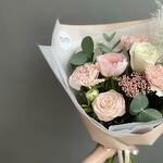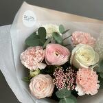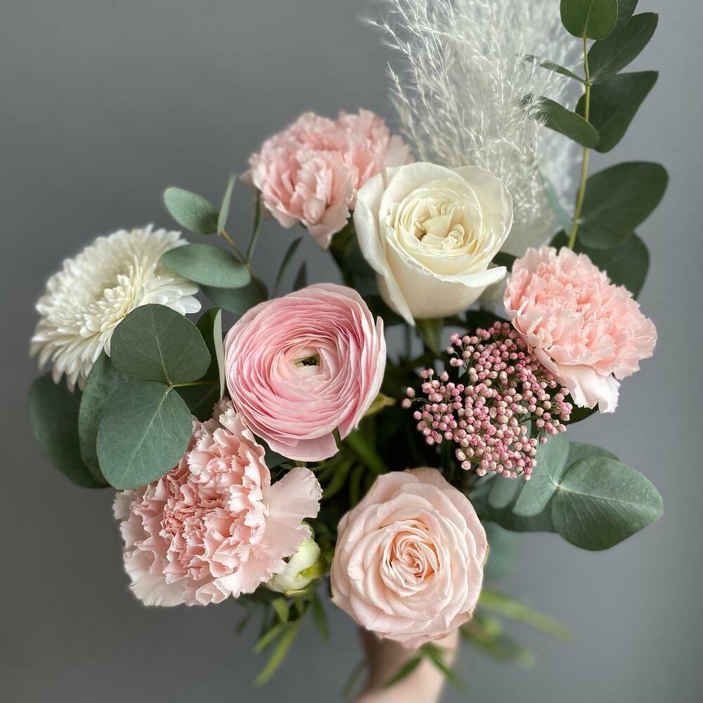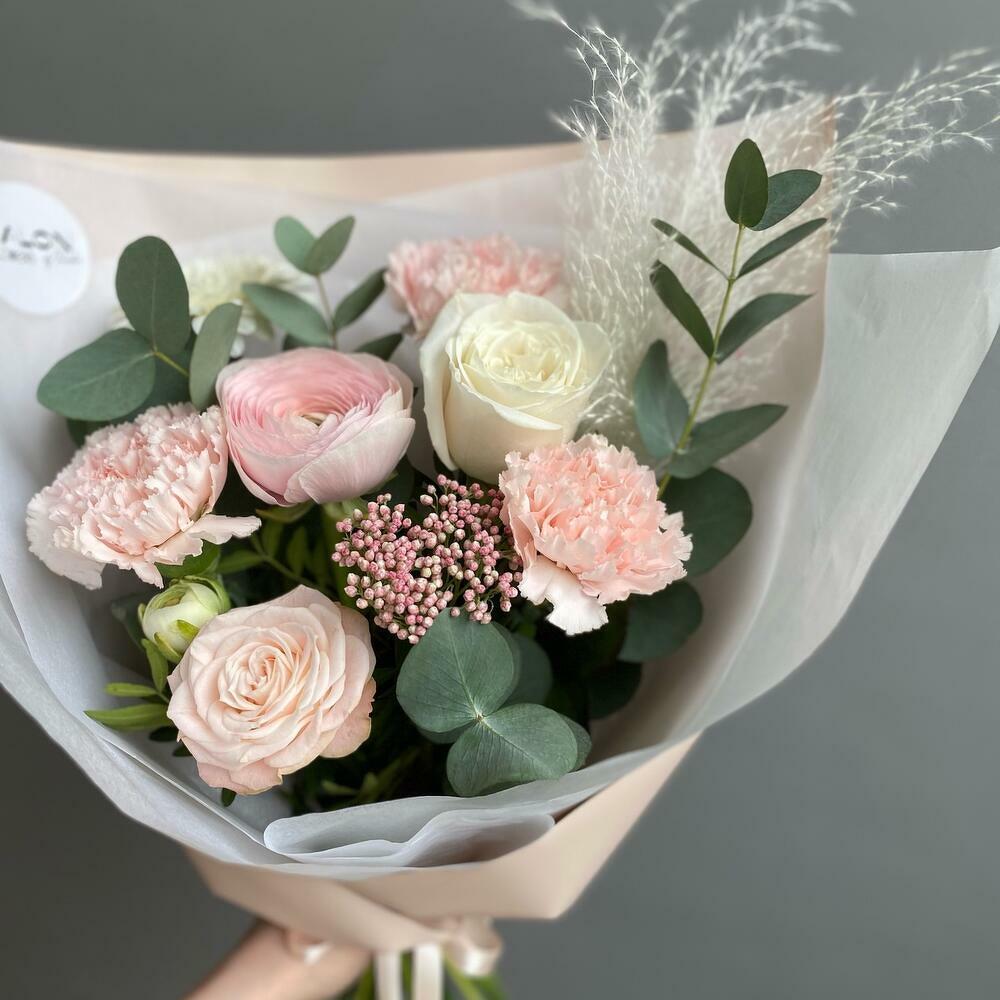 This exquisite bouquet from the florist, featuring Ranunculus, peony roses, and aromatic eucalyptus, makes a wonderful gift for any occasion or a delightful surprise 🌿