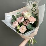 Ribbon - 2 pcs Peony rose - 1 pcs Eucalyptus - 5 pcs dianthus - 3 pcs ranunculus - 1 pcs gerbera mini - 1 pcs ozothamnus - 1 pcs designer wrapping - 2 pcs madam bombastic rose - 1 pcs pampas grass - 1 pcs