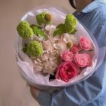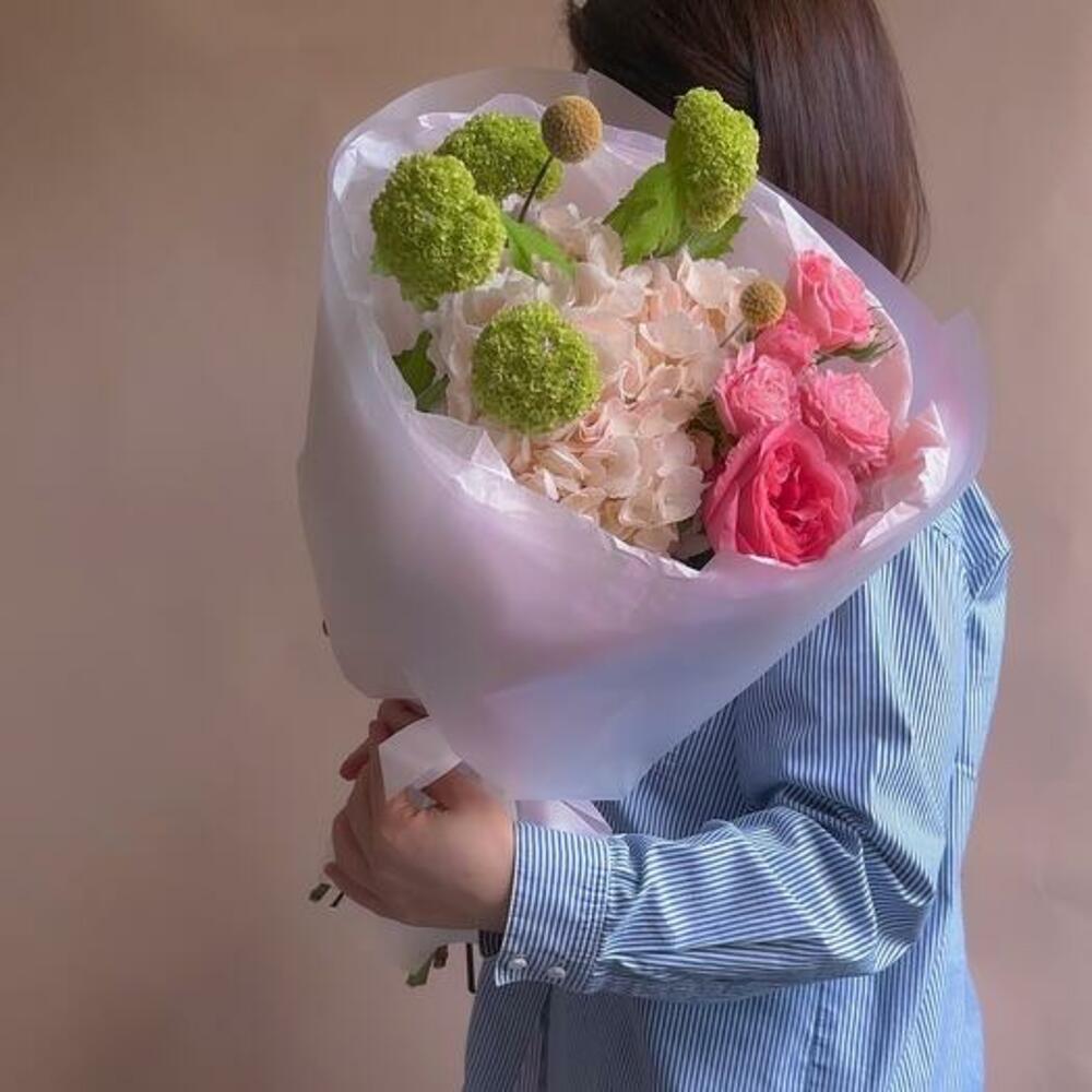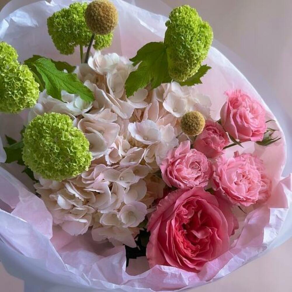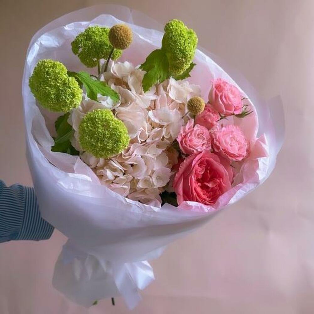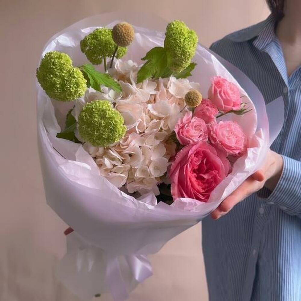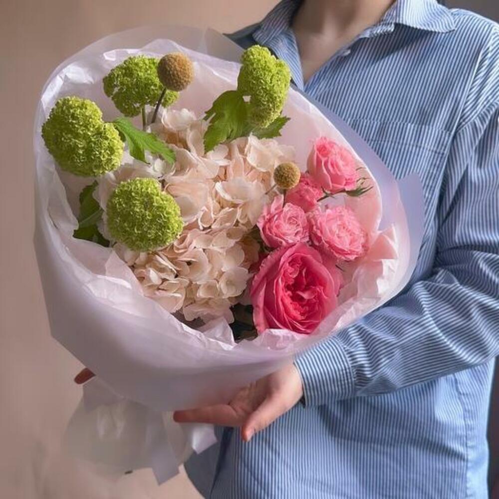 Peony rose - 1 pcs Spray rose - 1 pcs Hydrangea - 1 pcs Viburnum - 1 pcs packaging - 1 pcs craspedia - 2 pcs