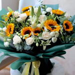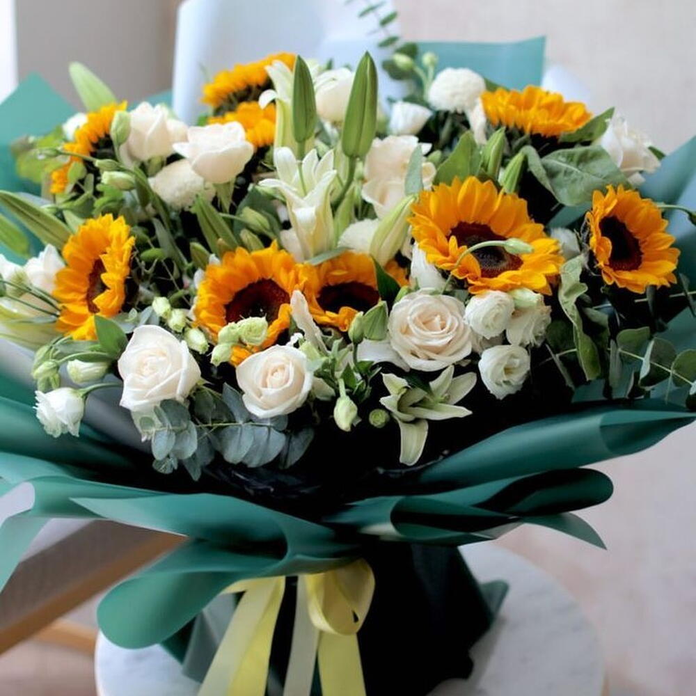 Eucalyptus - 10 pcs White lilies - 10 pcs sunflowers - 10 pcs white roses - 10 pcs white lisianthus. - 10 pcs