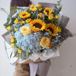 Eucalyptus - 10 pcs sunflowers - 5 pcs blue hydrangeas - 3 pcs stems of gypsophila - 7 pcs yellow spray roses - 10 pcs cream roses - 10 pcs