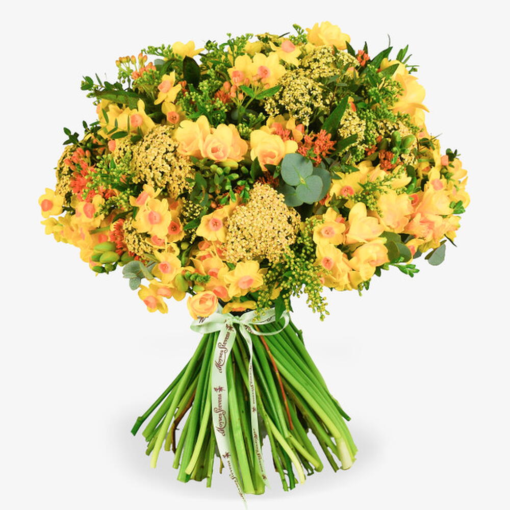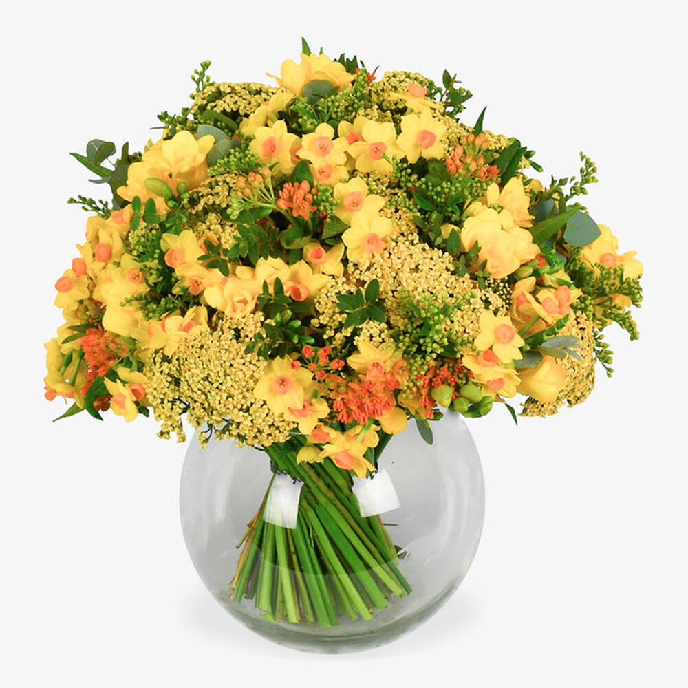 Embrace the peak of seasonal radiance with Sunlit Solstice, an exuberant hand-tied bouquet that captures the pure, golden energy of a clear sky. This luminous arrangement celebrates the vibrant interplay of sunny yellow hues, featuring a dense and fragrant mass of delicate freesia and nodding narcissi. We have layered these with architectural clusters of textured green umbels and hints of warm amber accents to create a rich, multidimensional display of color. It is a bold and joyful statement piece designed to transform any interior with its brilliant, light-reflecting charm.