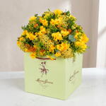 Embrace the peak of seasonal radiance with Sunlit Solstice, an exuberant hand-tied bouquet that captures the pure, golden energy of a clear sky. This luminous arrangement celebrates the vibrant interplay of sunny yellow hues, featuring a dense and fragrant mass of delicate freesia and nodding narcissi. We have layered these with architectural clusters of textured green umbels and hints of warm amber accents to create a rich, multidimensional display of color. It is a bold and joyful statement piece designed to transform any interior with its brilliant, light-reflecting charm.