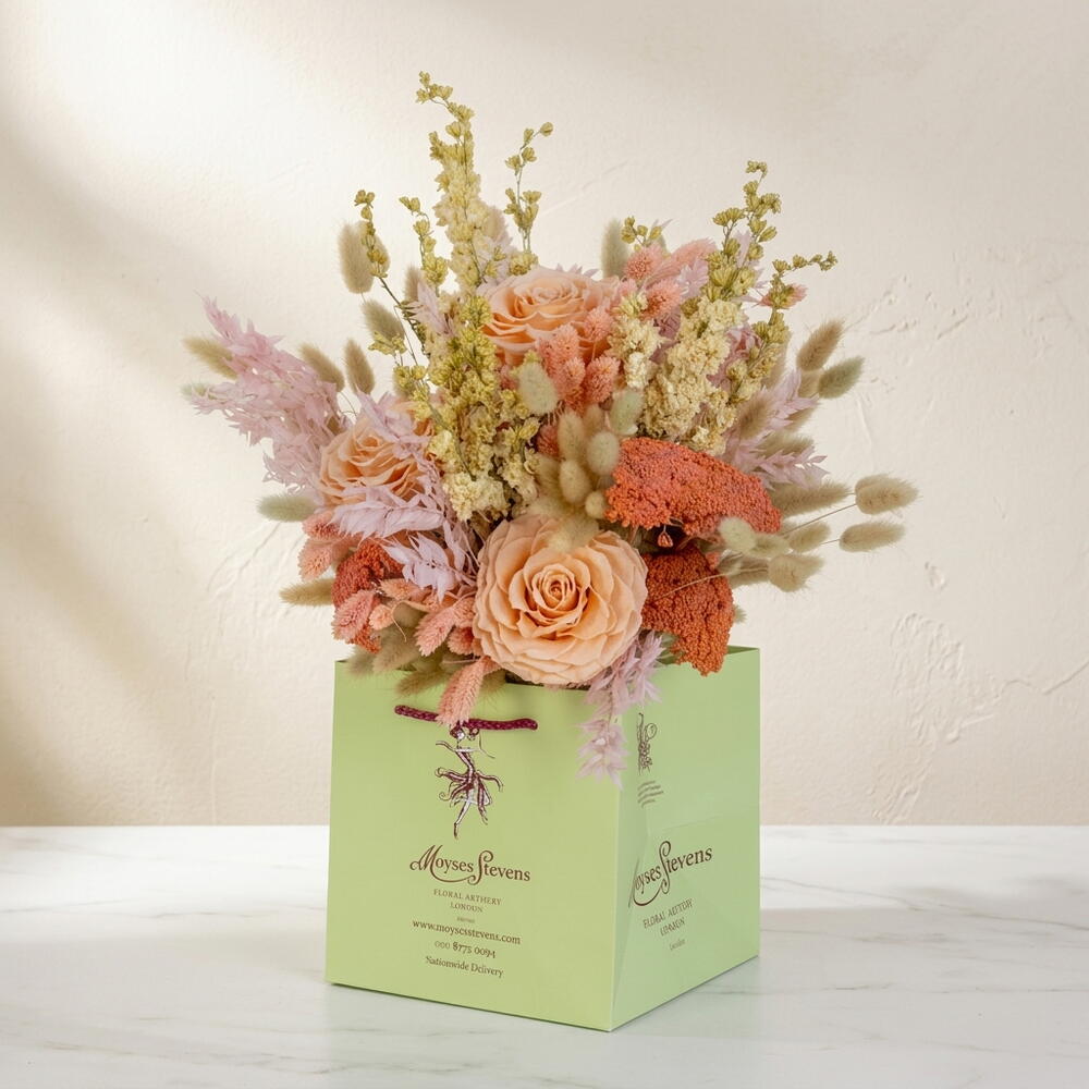Perfect for gifting or brightening up your home, this long-lasting bouquet brings a touch of natures beauty indoors without the hassle of maintenance. Arrangement features a harmonious blend of achilea, bunny tales, phalaris, and preserved ruscus, complemented by the timeless beauty of preserved roses.