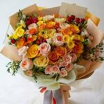 Yellow rose - 7 pcs cream rose - 7 pcs yellow spray rose - 7 pcs orange spray rose - 7 pcs red hypericum - 7 pcs cream spray rose - 7 pcs red spray rose - 7 pcs