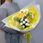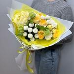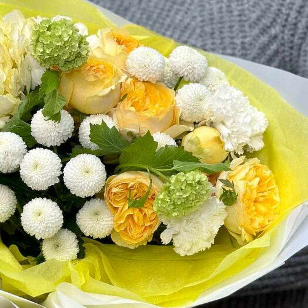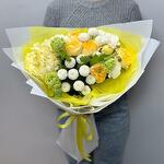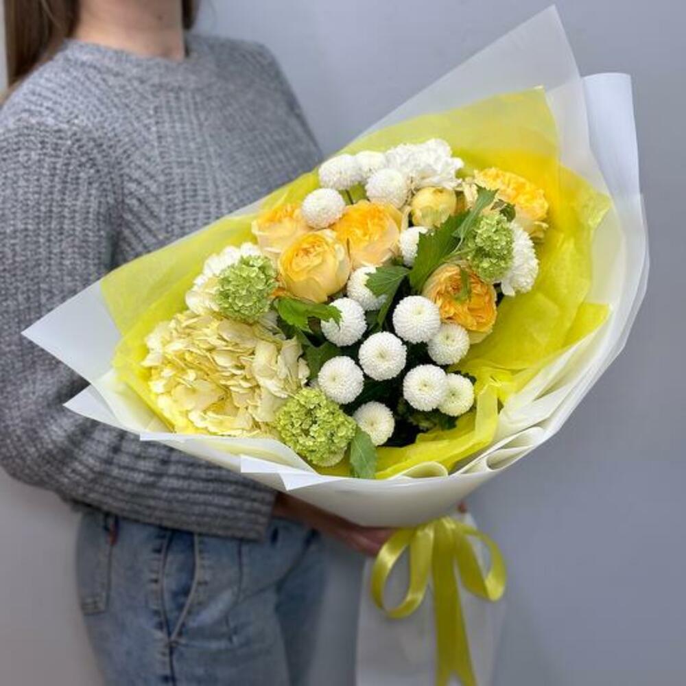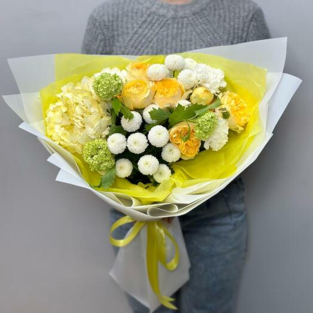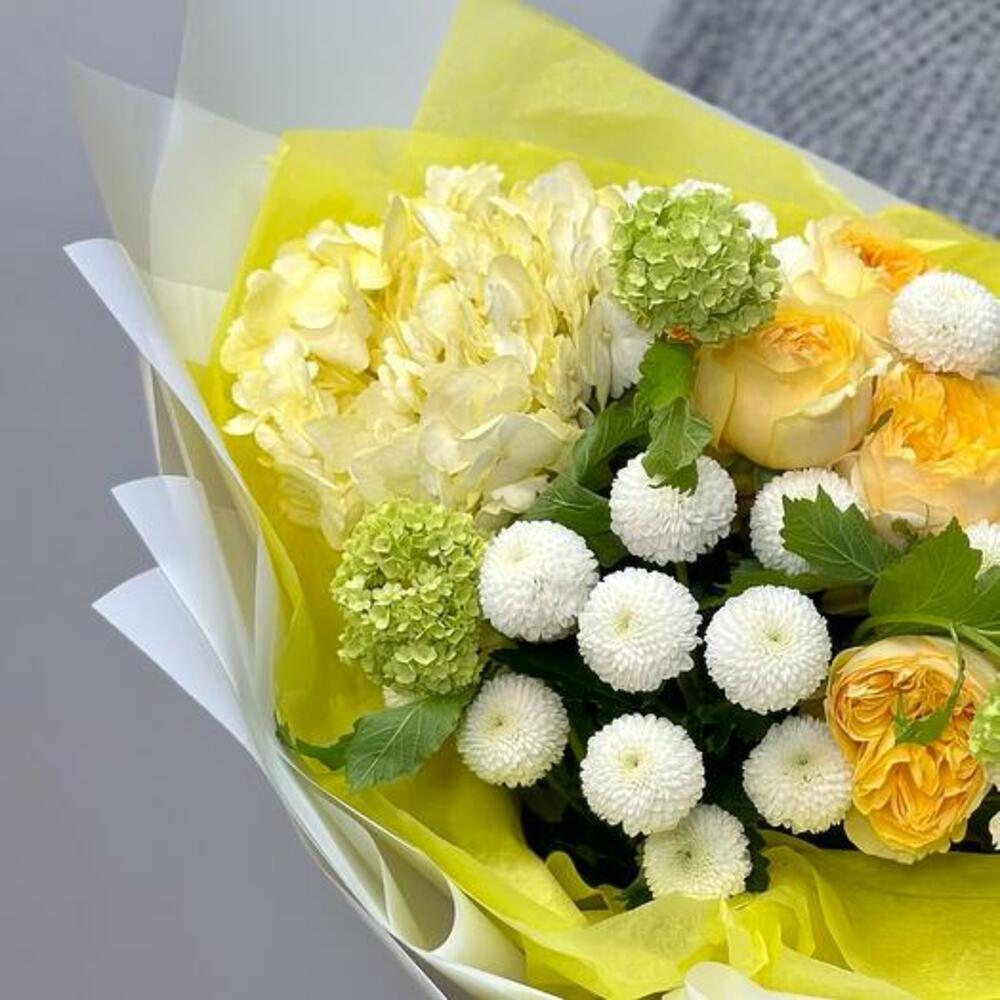 Hydrangea - 1 pcs Viburnum - 1 pcs Wrapping - 1 pcs dianthus white - 3 pcs newton chrysanthemum - 2 pcs silva sunny peony spray rose - 2 pcs