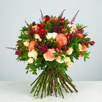 A memorable mix of peach roses and the ‘vintage’ spray variety, the composition is accentuated by bold pink bouvardia, red alstroemeria and astilbe.