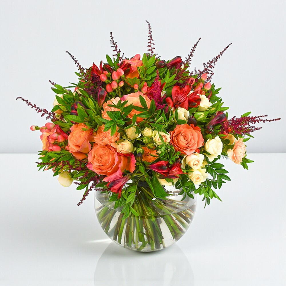 A memorable mix of peach roses and the ‘vintage’ spray variety, the composition is accentuated by bold pink bouvardia, red alstroemeria and astilbe.