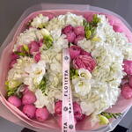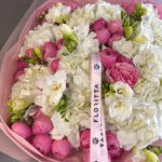 A beautifully feminine bouquet designed in soft cloud-like whites and delicate shades of pink. Lush hydrangeas create a voluminous, airy base, while premium garden roses and spray roses add romantic texture and depth. Fresh freesias introduce gentle fragrance and movement, completing the arrangement with a touch of elegance and purity.