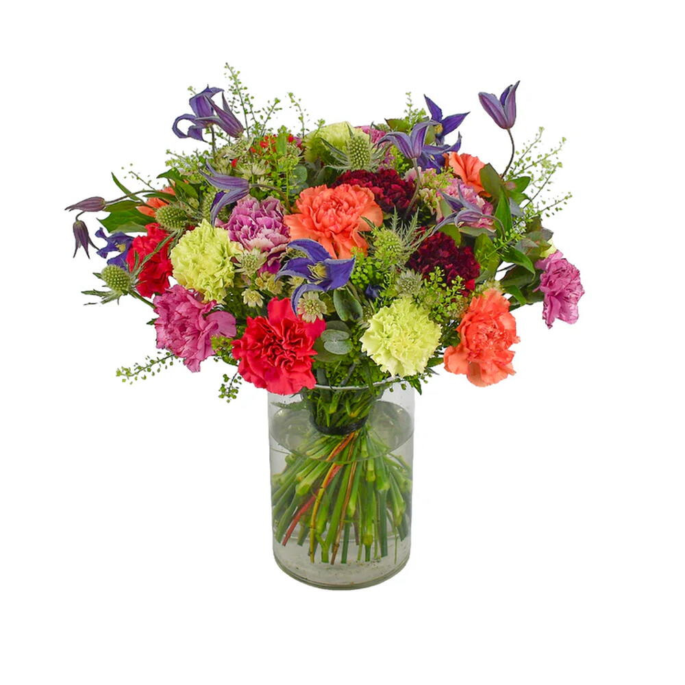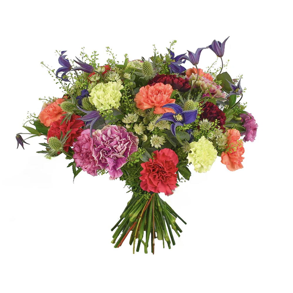 mixed carnations - 16 pcs white astrantia - 4 pcs purple clematis - 5 pcs seasonal greenery (bunch) - 1 pcs white thistle - 4 pcs