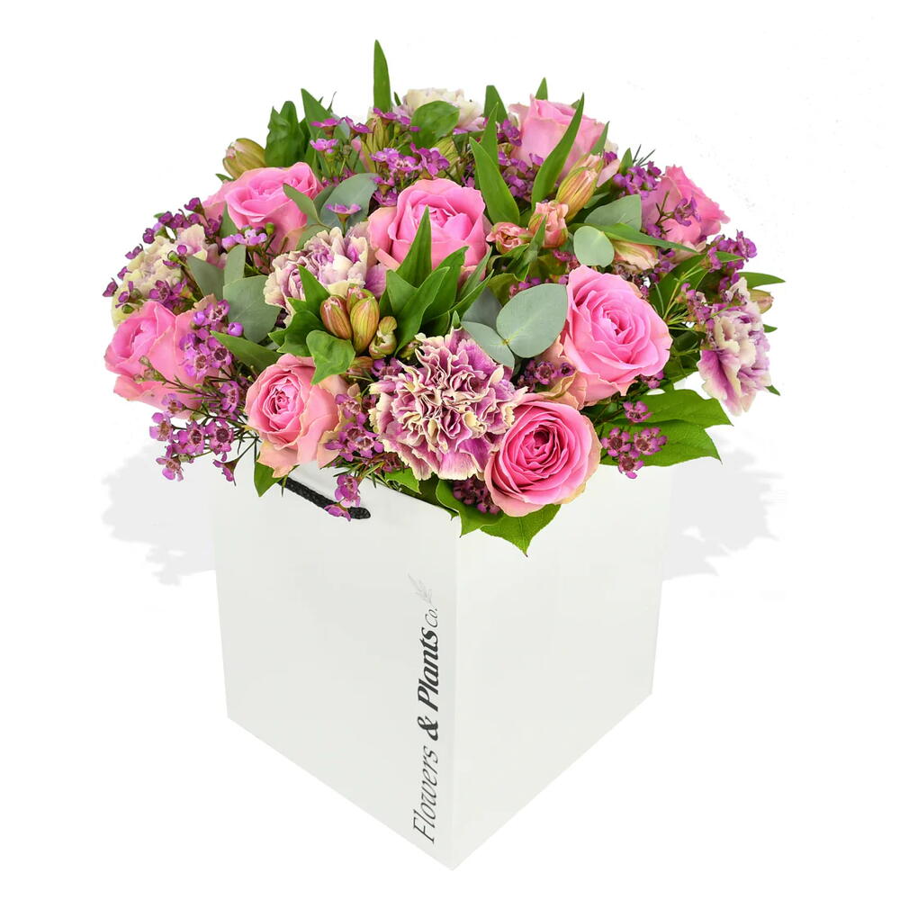 Expertly curated with a vibrant mix of pink roses, wax flower, carnations and alstroemeria, Sweet Pinks is a playful and plush floral arrangement. Complete with seasonal foliage and eucalyptus, its the perfect choice for brightening up any space.