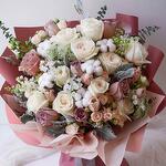 White rose - 12 pcs Cotton - 3 pcs peach rose - 8 pcs cream spray rose - 12 pcs white lilac - 7 pcs bunch of eucalyptus - 1 pcs peach stock - 10 pcs white astratia - 10 pcs