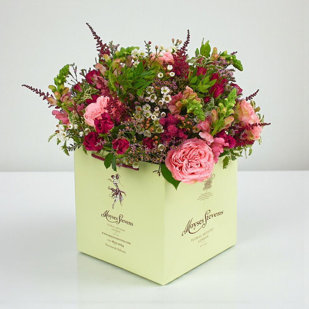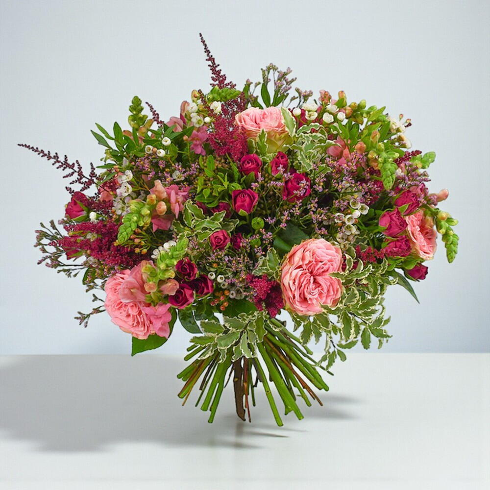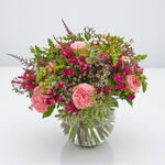 This playful and bright colour palette creates the basis for this enchanting bouquet. Fuchsia spray roses with hot pink roses and pink astilbe establish this fun and feminine design. Wilder in style but elegant as ever, this design is contrasted with dainty white alstroemeria and nigella white to form a dreamy display. Finished with lightly fragrant rosemary and seasonal greenery, this bouquet makes for a lovely gift for a friend or loved one with its romantic yet youthful charm.
