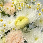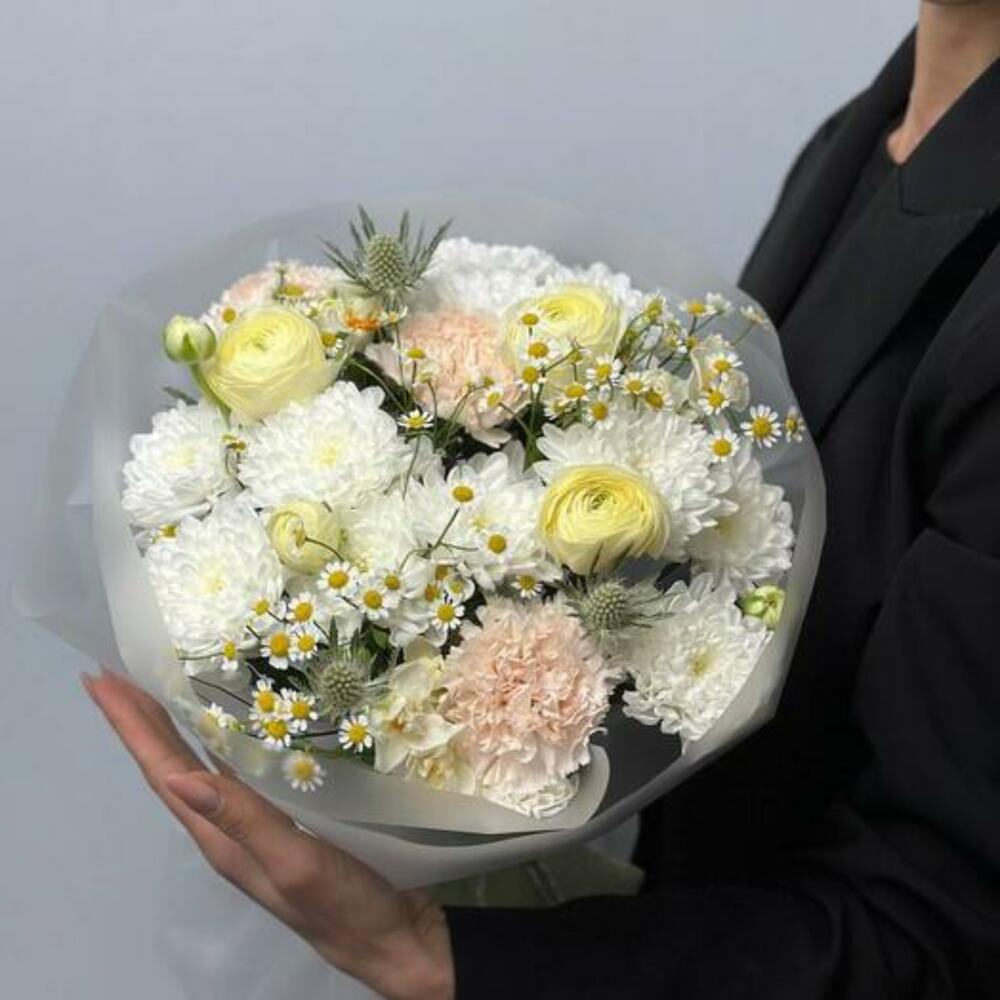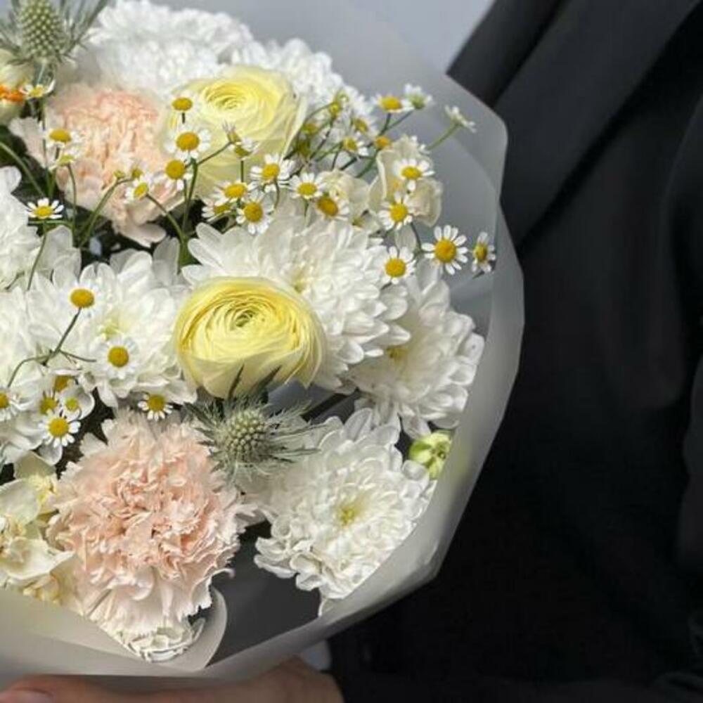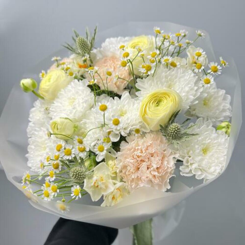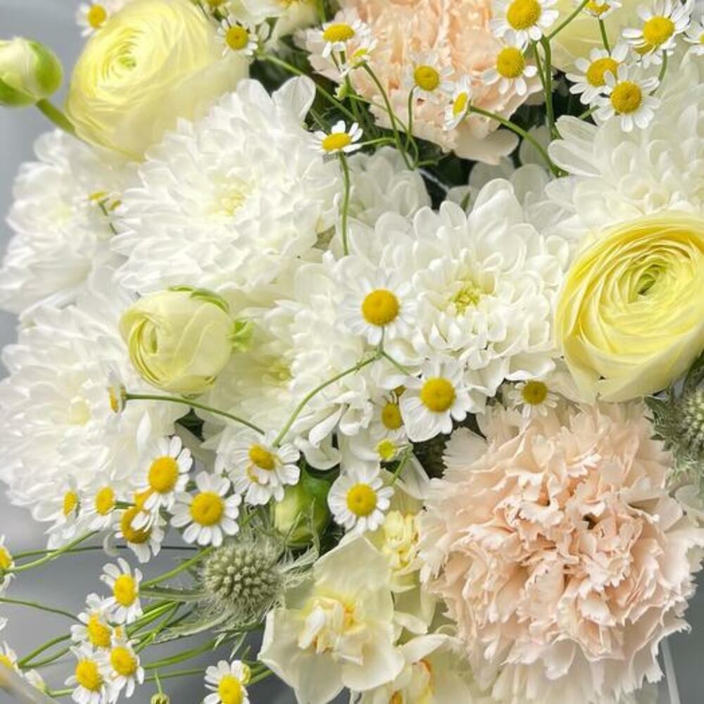 Daffodil - 3 pcs packaging - 1 pcs dianthus - 3 pcs ranunculus - 3 pcs eryngium - 2 pcs matricaria - 3 pcs chrysanthemum spray - 3 pcs