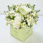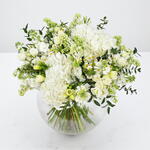 Effortless elegance abounds in this subtle yet striking bouquet of hydrangeas, daisies, eucalyptus and freesias. Flashes of verdant green provide the backdrop for the flamboyance and fluffy exuberance of our hydrangeas, while sprigs of parvifolia eucalyptus transport us to a distinctly Grecian world.