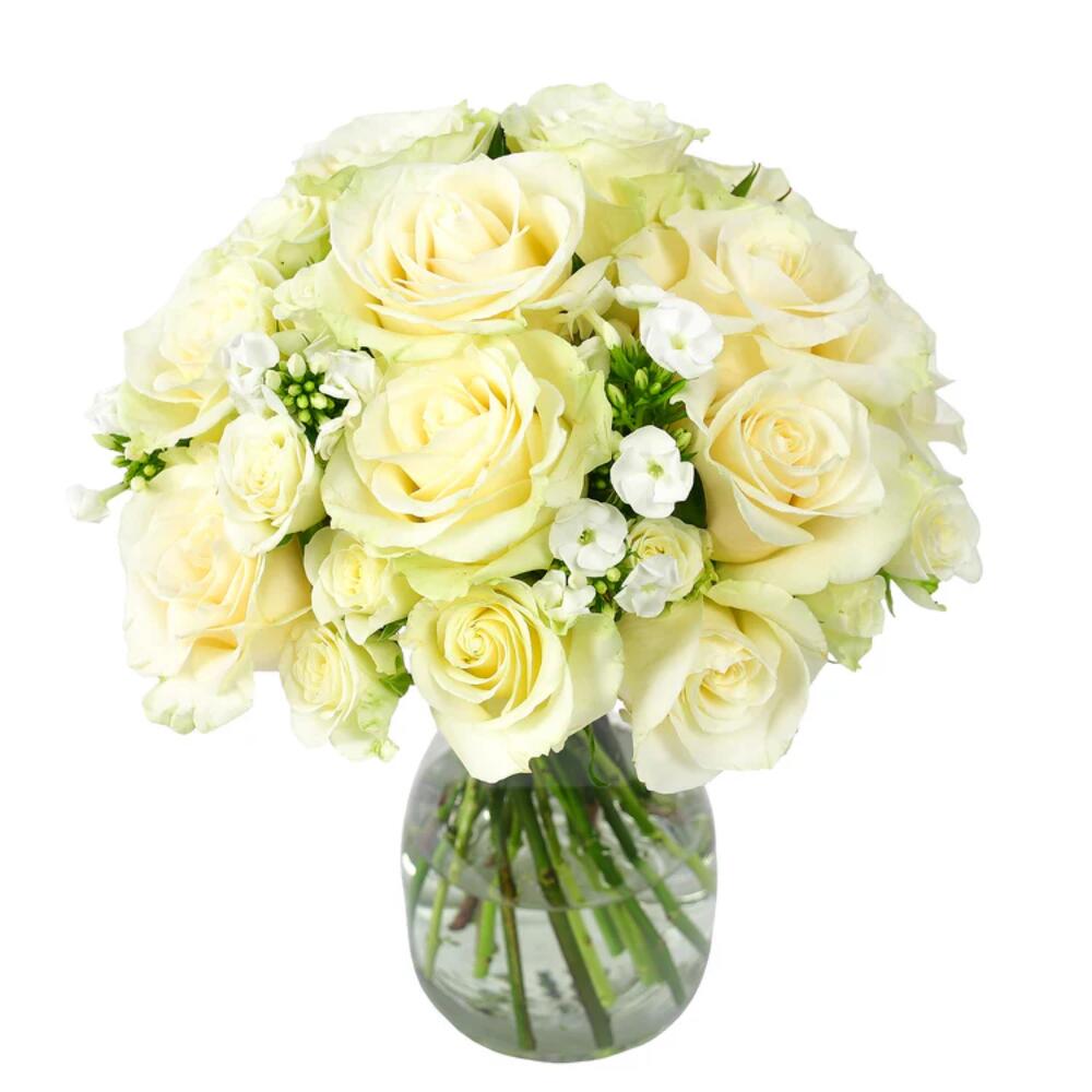 white roses - 8 pcs white spray roses - 6 pcs white phlox - 7 pcs seasonal foliage (bunch) - 1 pcs
