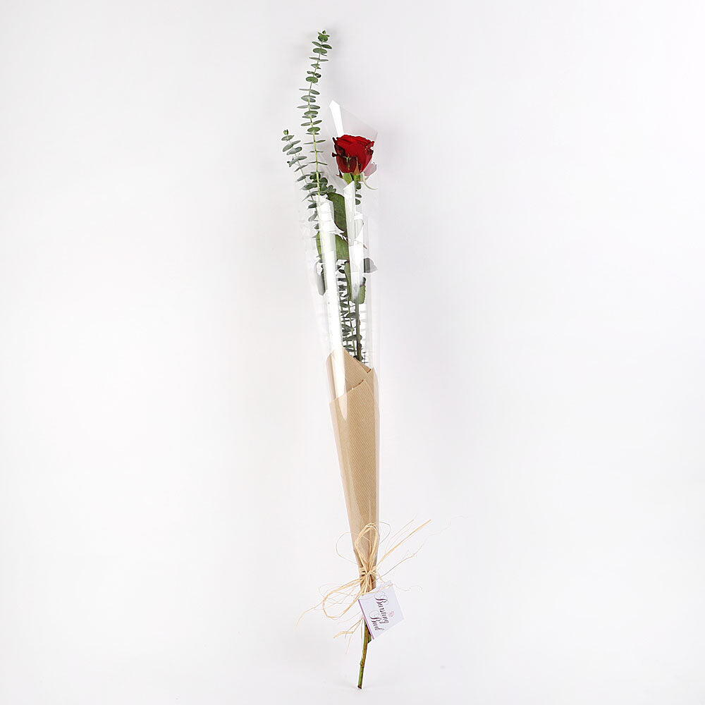 This charming bouquet features a single, perfect red rose, symbolizing deep love and devotion, paired with delicate eucalyptus leaves that add a fresh and elegant touch. A simple yet powerful gesture, this bouquet is ideal for expressing your feelings in the most romantic way. It’s beautifully wrapped in eco-friendly paper, tied with a rustic twine, making it an understated and thoughtful gift. Whether as a token of appreciation or a romantic gesture, this bouquet delivers a heartfelt message.