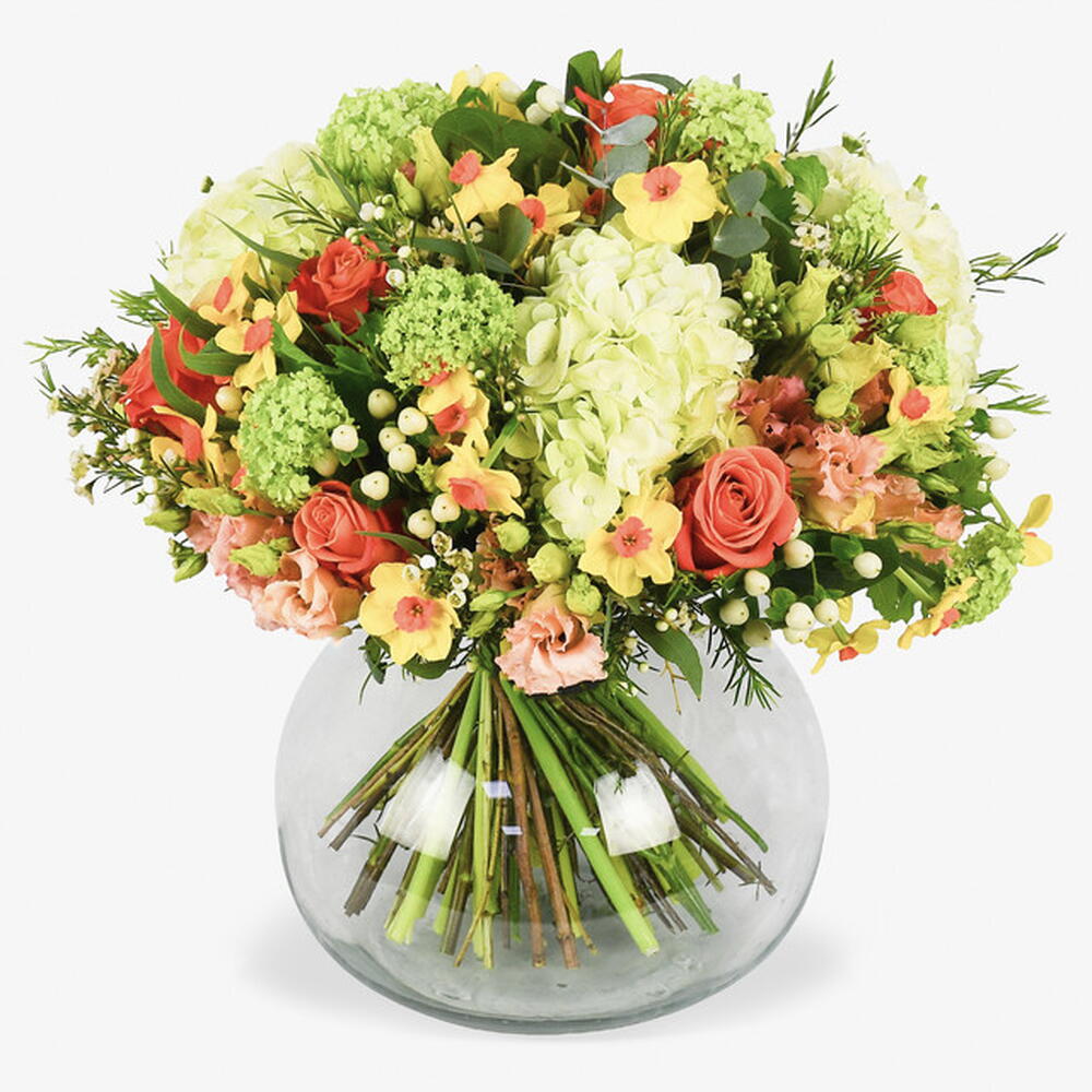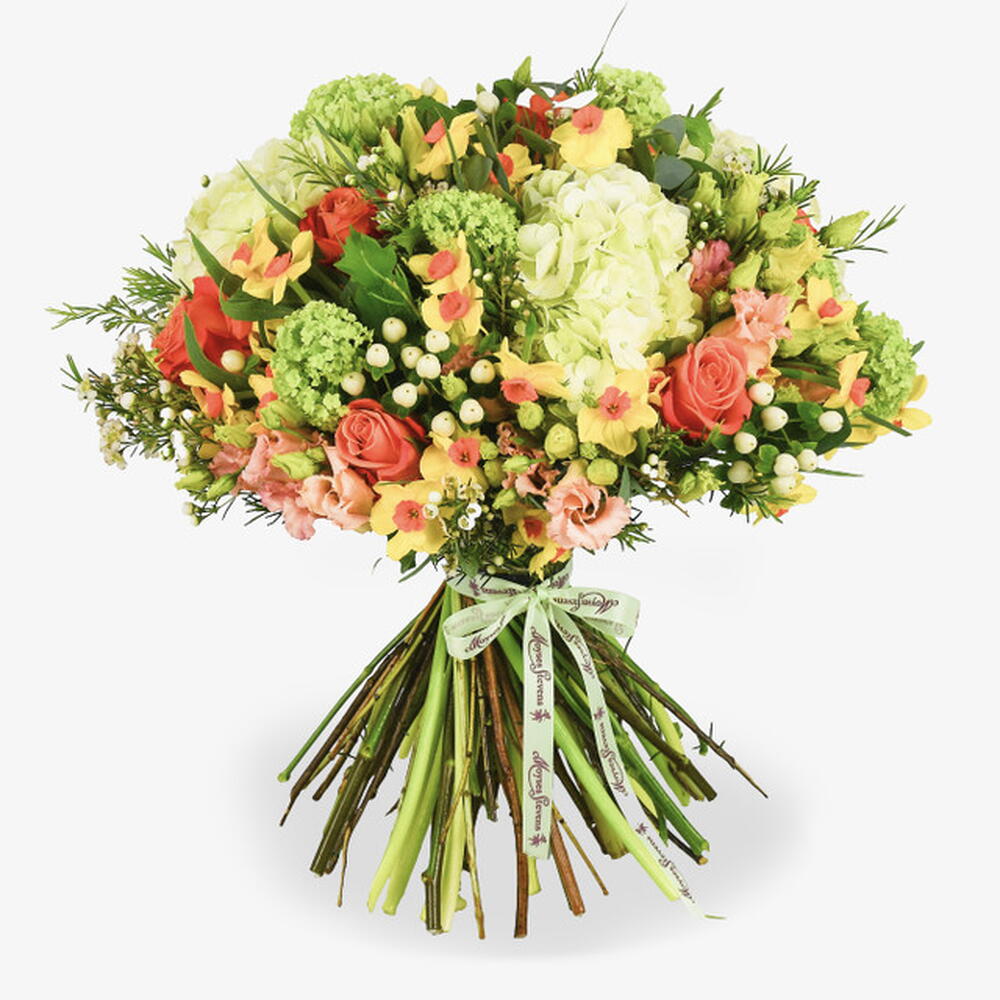 Bright, bold, and brimming with texture, The Orchard Path is a vibrant celebration of seasonal contrast. This striking hand-tied bouquet pairs the architectural fullness of lime-green hydrangeas with the glowing warmth of premium coral roses and ruffled peach lisianthus. Accented with cheerful yellow narcissi and crisp clusters of white hypericum berries, it offers a sophisticated tapestry of citrus and sunset tones.