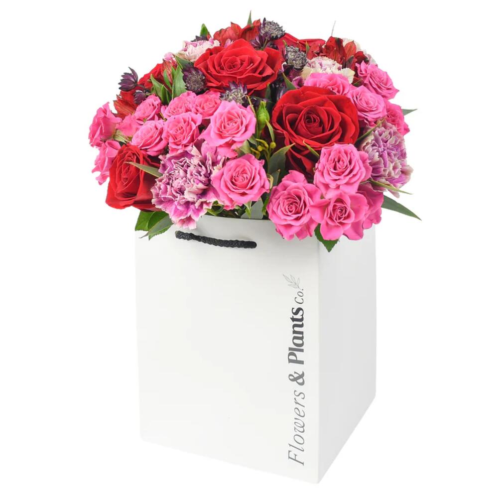 Dusky pink carnations and spray roses; sprigs of eucalyptus; premium red roses fresh astrantia. Our fabulous ‘Pink Lady’ is a pastel toned triumph with a hint of woody fragrance and laid-back airs.