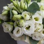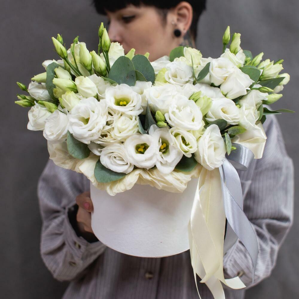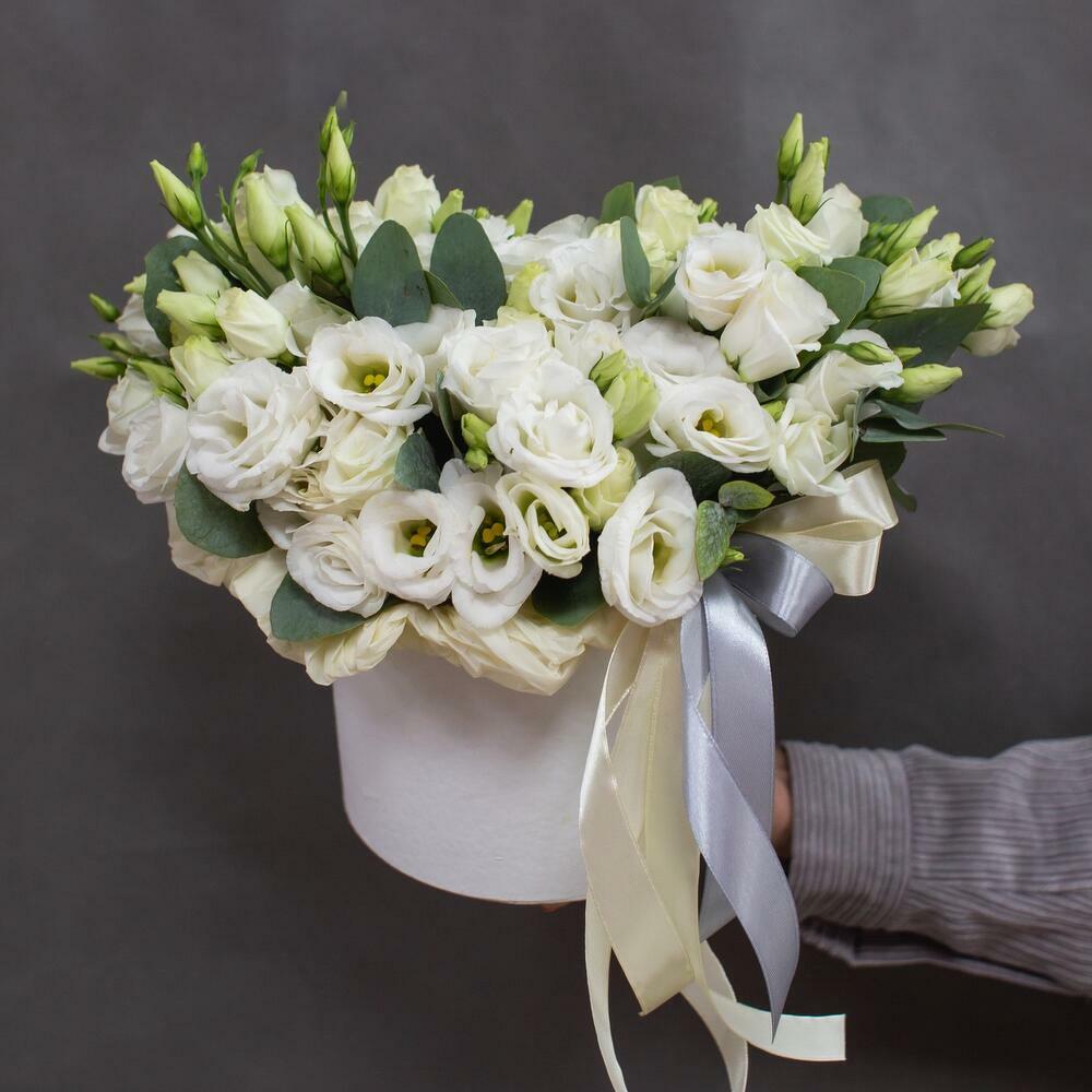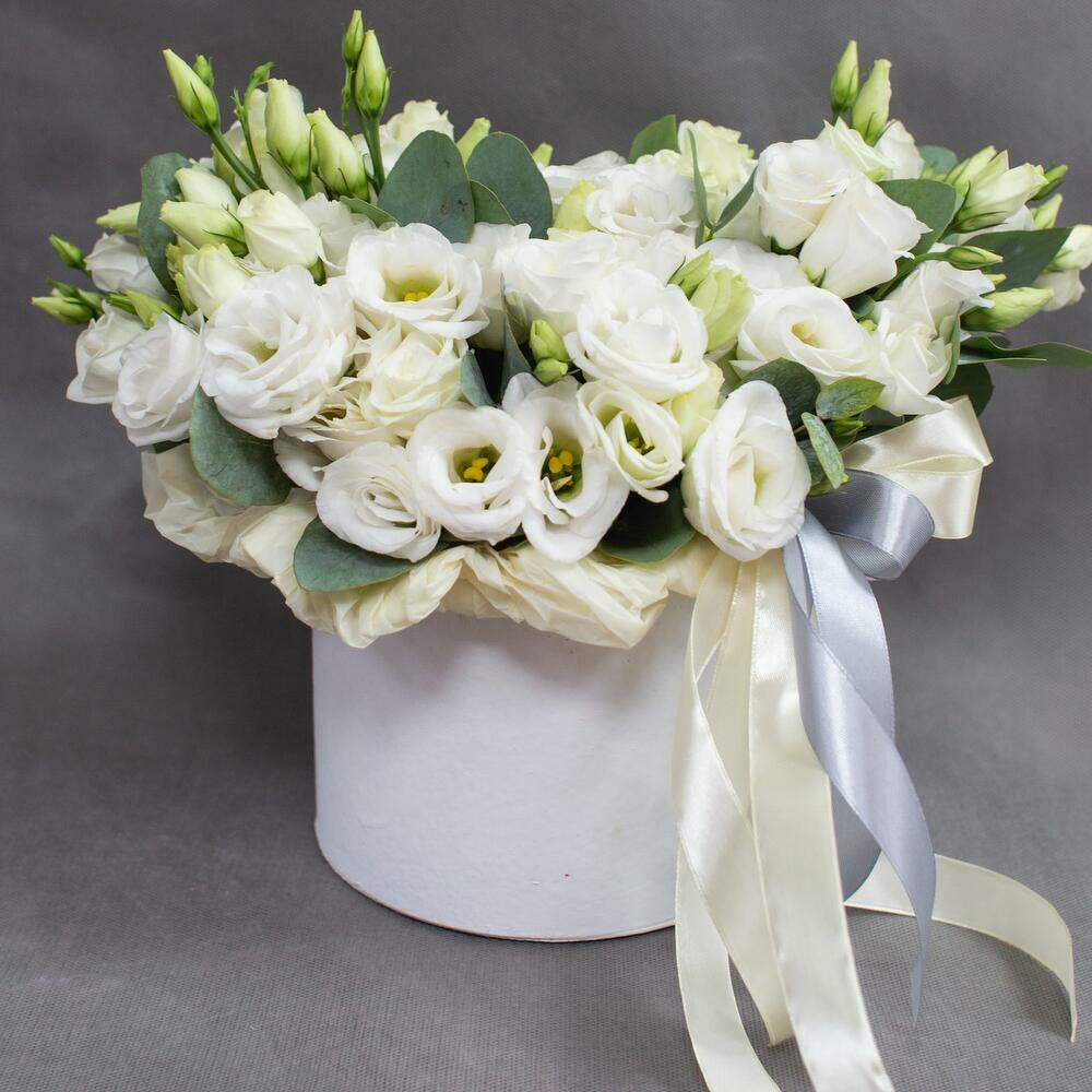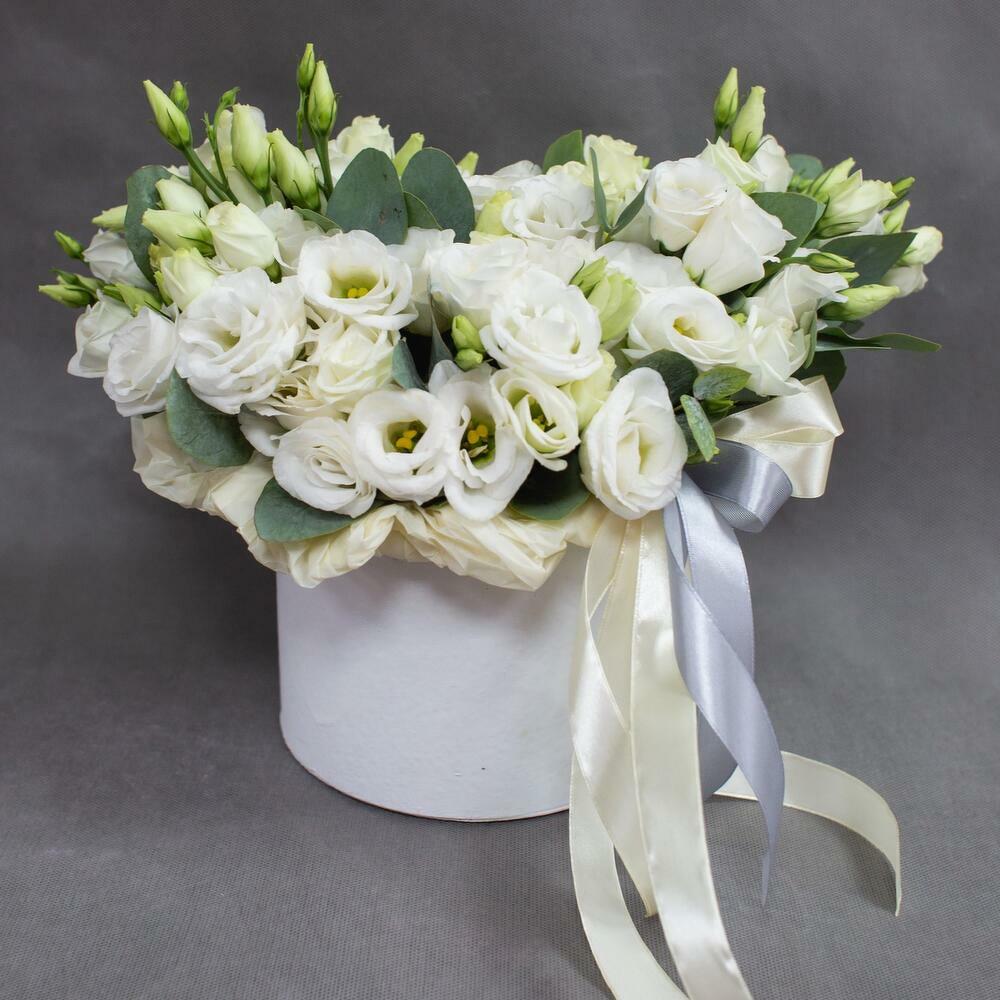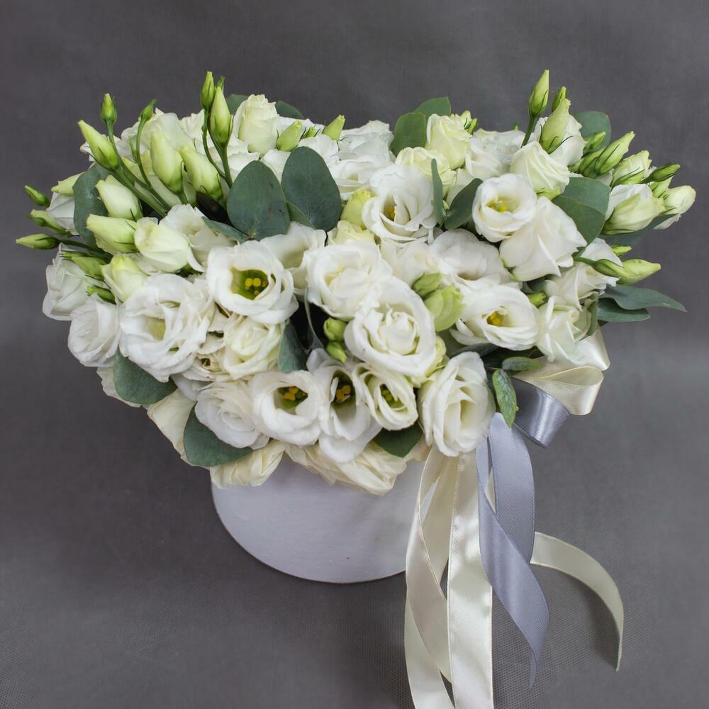 Satin ribbon - 1 pcs Eucalyptus - 2 pcs Box - 1 pcs white eustoma - 10 pcs
