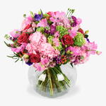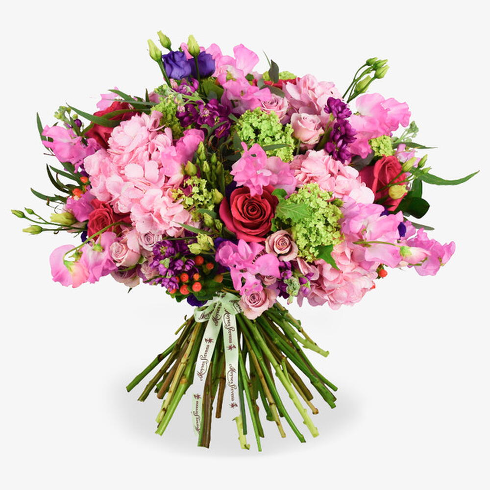 Embrace the delicate, whimsical charm of the season with The Sweet Pea, a voluminous hand-tied bouquet that celebrates one of nature’s most fragrant treasures. This decadent arrangement weaves the ruffled, butterfly-like petals of premium sweet peas through a lush foundation of cloud-like pink hydrangeas and velvety deep-rose blooms. Accented with fragrant purple stocks, lime-green guelder rose, and pops of bright orange berries, it offers a sophisticated tapestry of texture and high-contrast color. It is a graceful yet high-impact choice, designed to fill any space with a light, nostalgic scent and a grand sense of seasonal elegance.
