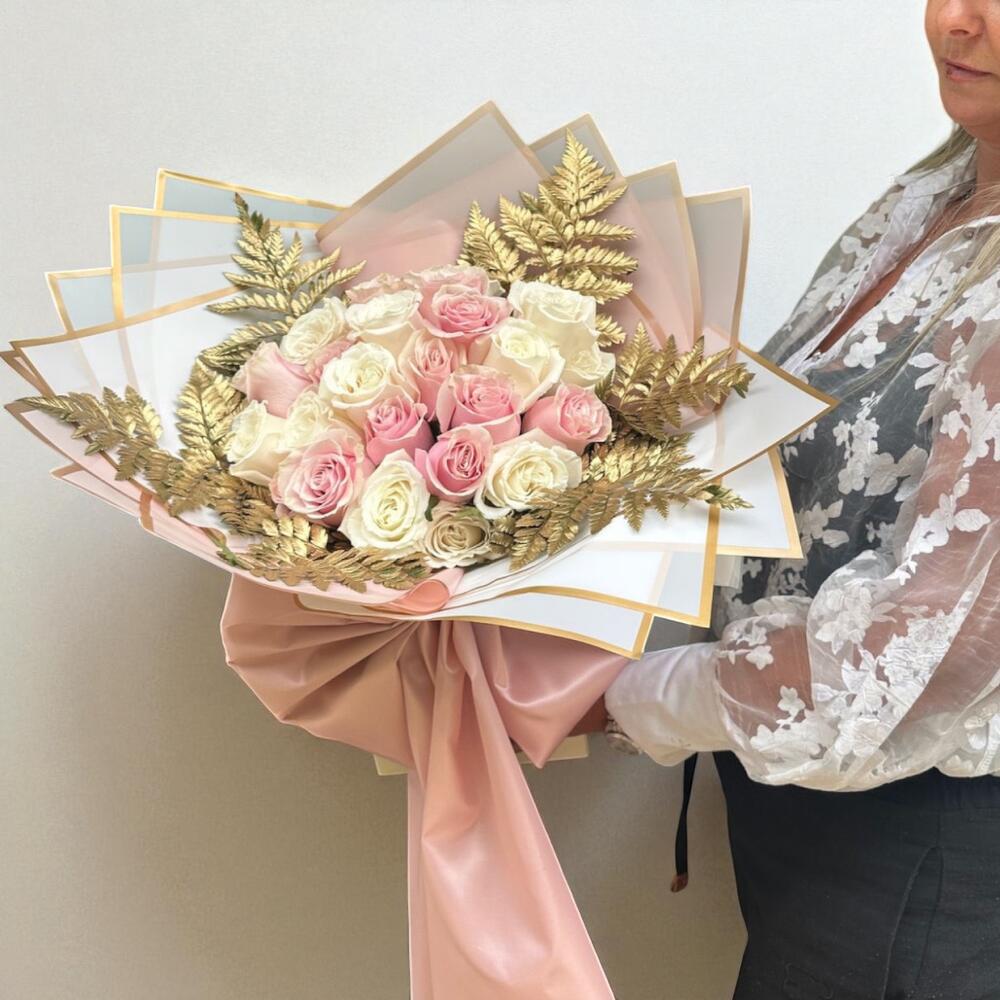 Eustoma - 5 pcs snapdragons - 5 pcs hydrangeas - 6 pcs hypericum berries - 5 pcs roses - 8 pcs spray roses - 5 pcs gold leaf foliage - 7 pcs