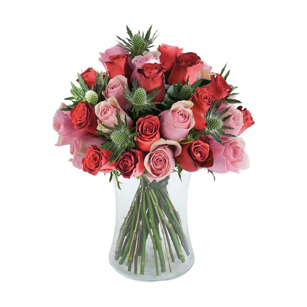 Velvety roses meet the wild, sculptural beauty of thistle in an arrangement that is equal parts romantic and untamed. A striking gift for those who love flowers with a little edge.
