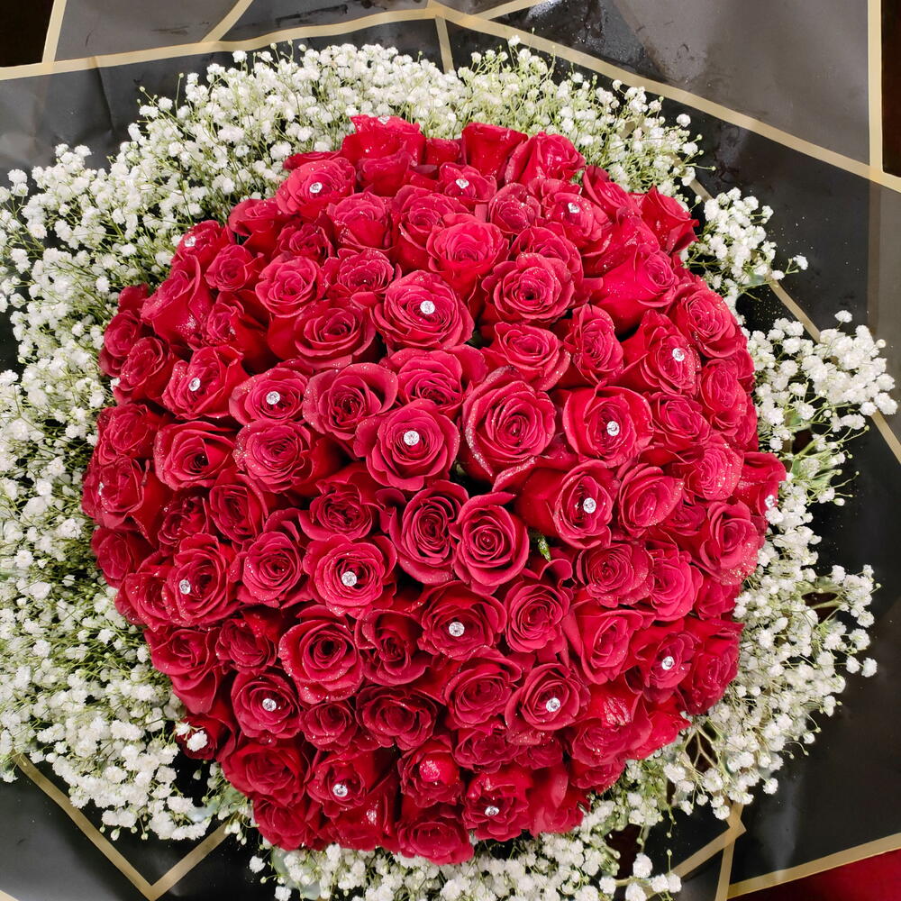 A truly show-stopping Valentine’s arrangement. This luxurious bouquet features 100 premium red roses, beautifully framed with a white gypsophila (baby’s breath) collar for a stunning, elegant finish. A grand, classic display of love and devotion—perfect for an unforgettable romantic gesture.