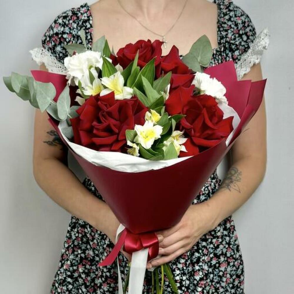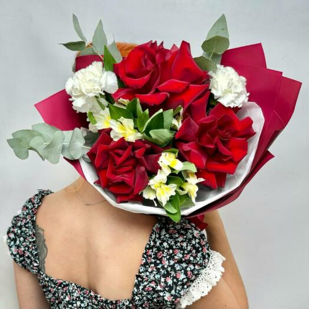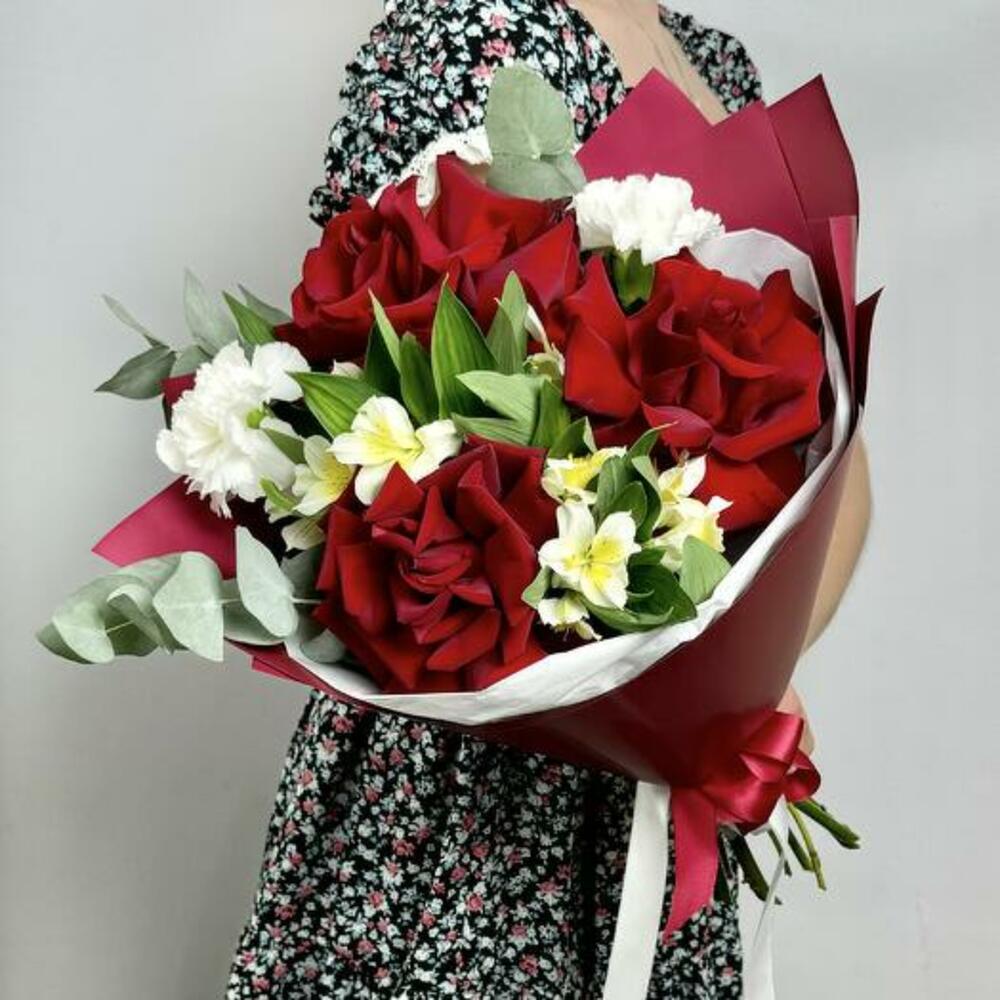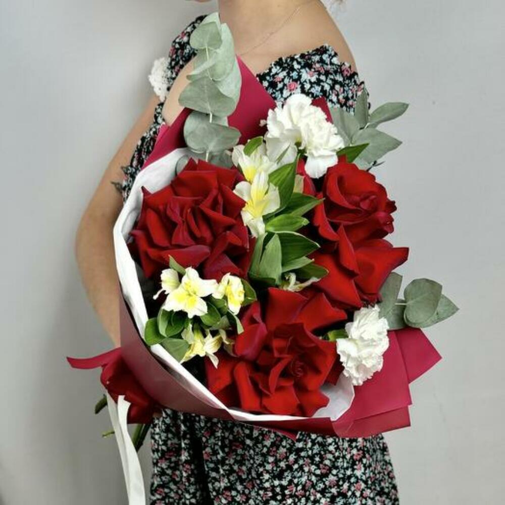 Satin ribbon - 2 pcs Eucalyptus - 1 pcs Alstroemeria - 2 pcs dianthus white - 2 pcs design packaging - 2 pcs french rose - 3 pcs