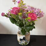 Tulip - 5 pcs Orchid - 1 pcs gipsophila - 3 pcs mixed foliage - 3 pcs roses - 5 pcs