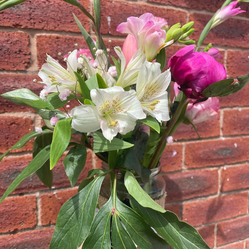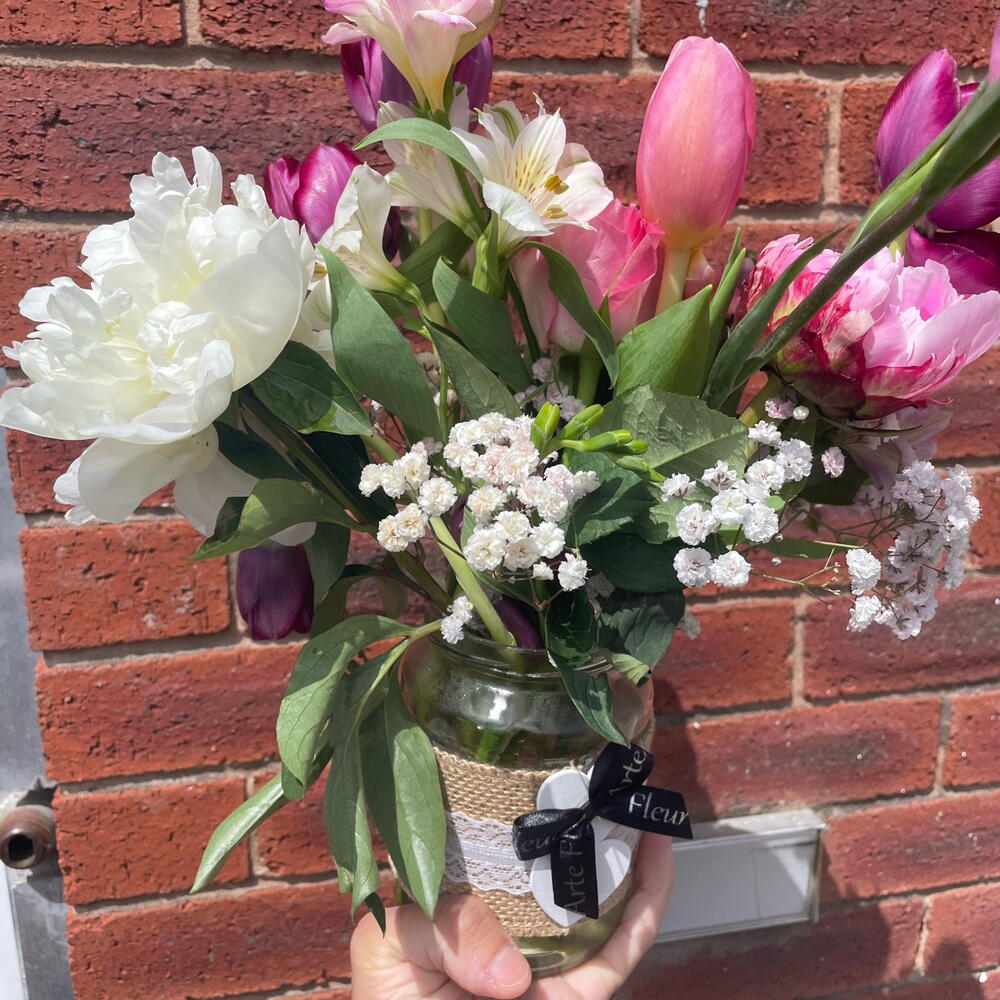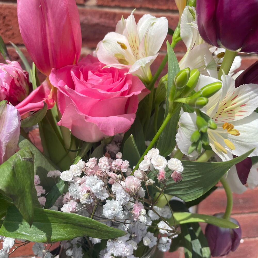 Tulips - 3 pcs Alstroemeria - 2 pcs Gypsophila - 3 pcs Peonies - 3 pcs roses - 4 pcs