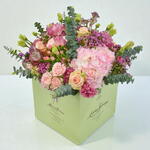 purple astrantia - 5 pcs pink lisianthus - 5 pcs pink hydrangea - 3 pcs pink hypericum - 5 pcs pink wax flowers - 5 pcs pink roses - 5 pcs pink spray roses - 5 pcs seasonal greenery (bunch) - 1 pcs