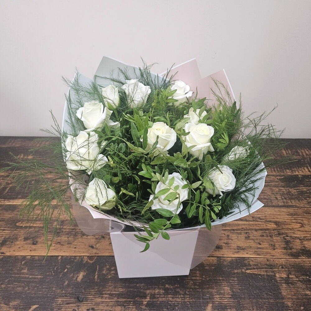 A graceful and elegant bouquet that embodies purity, calmness, and timeless beauty. The soft white roses are complemented by lush greenery, creating a harmonious and sophisticated composition. Perfect for expressing sincere emotions — whether it’s sympathy, respect, or heartfelt gratitude. The natural tones and refined style make it suitable for both solemn occasions and classic interior décor. To maintain the bouquet’s freshness, keep it in cool, clean water, trim the stems diagonally every two days, and remove any leaves below the waterline. A serene arrangement that speaks through quiet elegance.