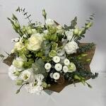 white lisianthus - 4 pcs white avalanche rose - 6 pcs greenery mix - 5 pcs white chrisantemum - 2 pcs