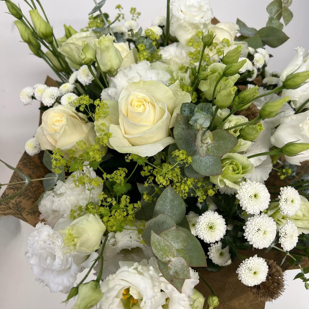 white lisianthus - 4 pcs white avalanche rose - 6 pcs greenery mix - 5 pcs white chrisantemum - 2 pcs
