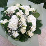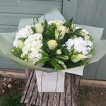 A classical beauty - White hydrangeas roses bouquet, includes large headed fluffy white hydrangeas, long stemmed white roses, white alstroemeria and and array of lush mixed foliage. Aqua packed, bouquet delivered in water. Bouquet shown in picture is Extra Large option - your bouquet will be the same style but smaller - please check description for specifications Next day delivery available Please note that due to the seasonal availability of flowers it may be necessary to vary individual stems from those shown. We may substitute flowers for one similar in style, quality and value.