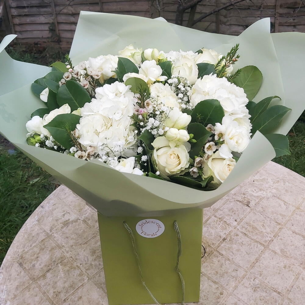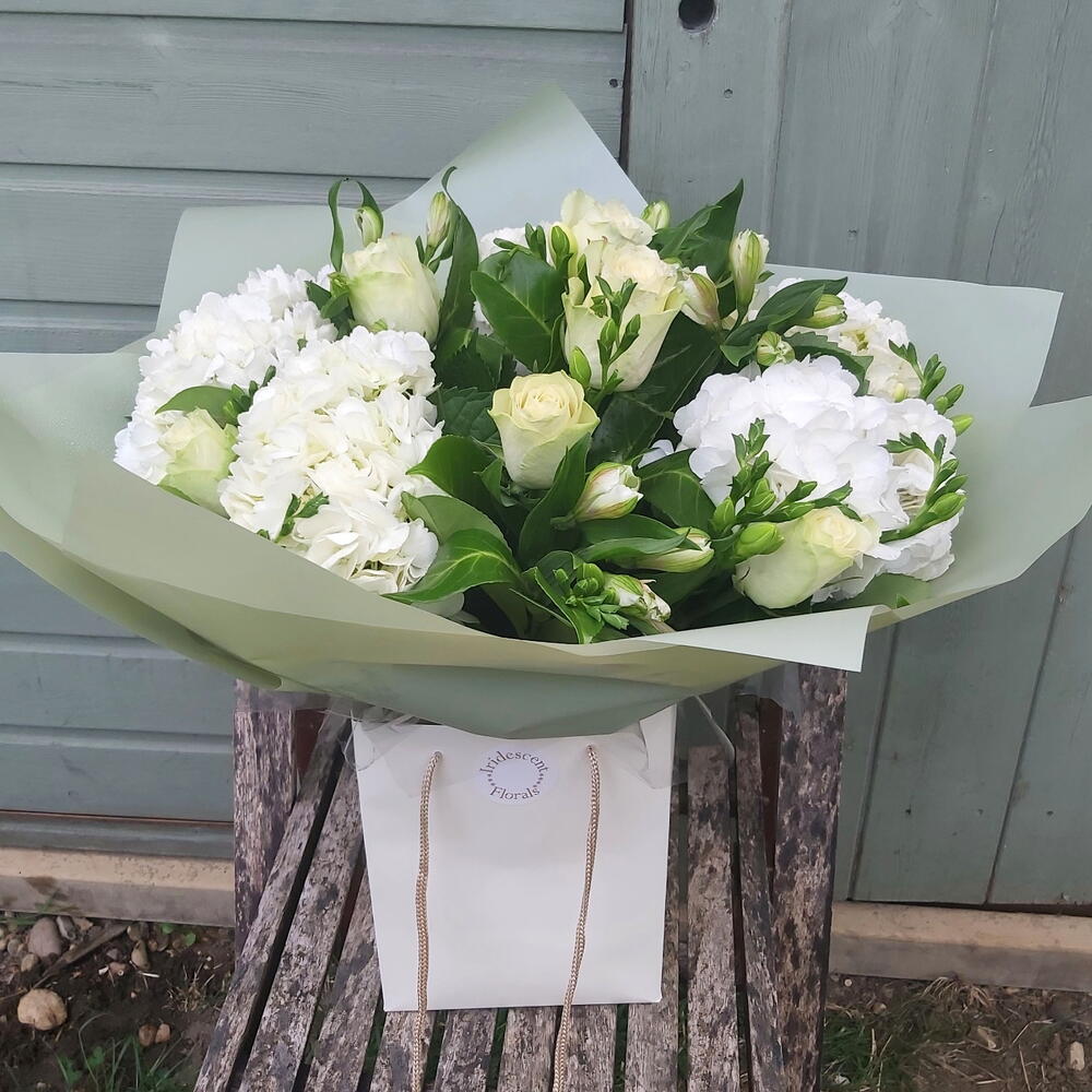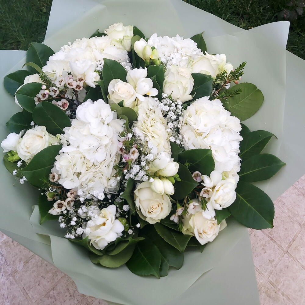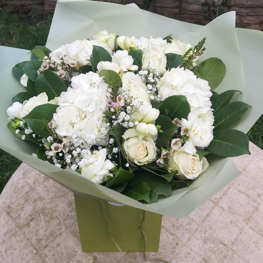 A classical beauty - White hydrangeas roses bouquet, includes large headed fluffy white hydrangeas, long stemmed white roses, white alstroemeria and and array of lush mixed foliage. Aqua packed, bouquet delivered in water. Bouquet shown in picture is Extra Large option - your bouquet will be the same style but smaller - please check description for specifications Next day delivery available Please note that due to the seasonal availability of flowers it may be necessary to vary individual stems from those shown. We may substitute flowers for one similar in style, quality and value.