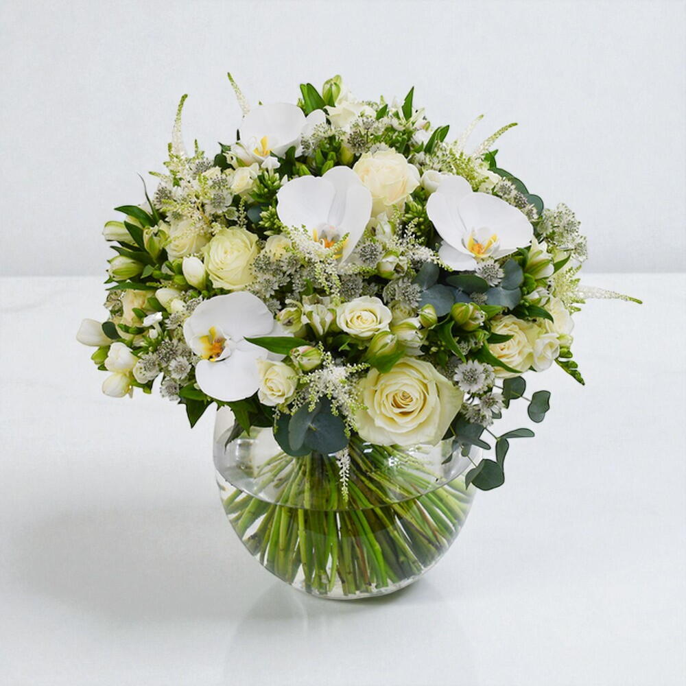 This carefully arranged bouquet features a selection of premium white roses complemented by phalaenopsis orchids, known for their elegant appearance and lasting quality. The composition includes freesia, which adds a subtle fragrance, and alstroemeria, valued for its extended vase life.