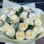 Delight in the ethereal beauty of this Mono Bouquet, composed of 20 hand-picked white avalanche roses beautifully accented with 150g of lush cinerea eucalyptus. A breathtaking blend of elegance and simplicity, this bouquet makes the perfect gift for any occasion or simply a stunning centerpiece for your home. Plucked at the peak of freshness, each stunning bloom and silvery sprig of eucalyptus is thoughtfully arranged to create a lasting impression. This bouquet truly embodies pure elegance and timeless charm.