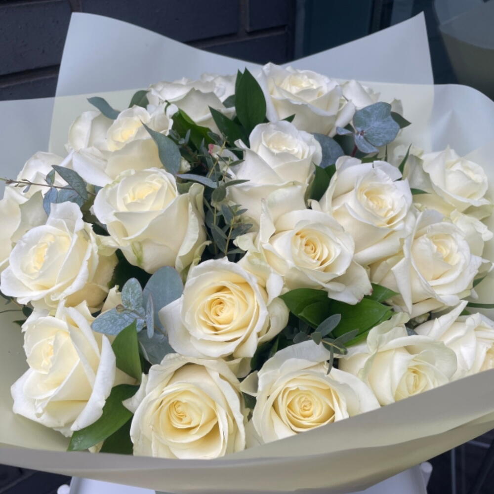 Delight in the ethereal beauty of this Mono Bouquet, composed of 20 hand-picked white avalanche roses beautifully accented with 150g of lush cinerea eucalyptus. A breathtaking blend of elegance and simplicity, this bouquet makes the perfect gift for any occasion or simply a stunning centerpiece for your home. Plucked at the peak of freshness, each stunning bloom and silvery sprig of eucalyptus is thoughtfully arranged to create a lasting impression. This bouquet truly embodies pure elegance and timeless charm.